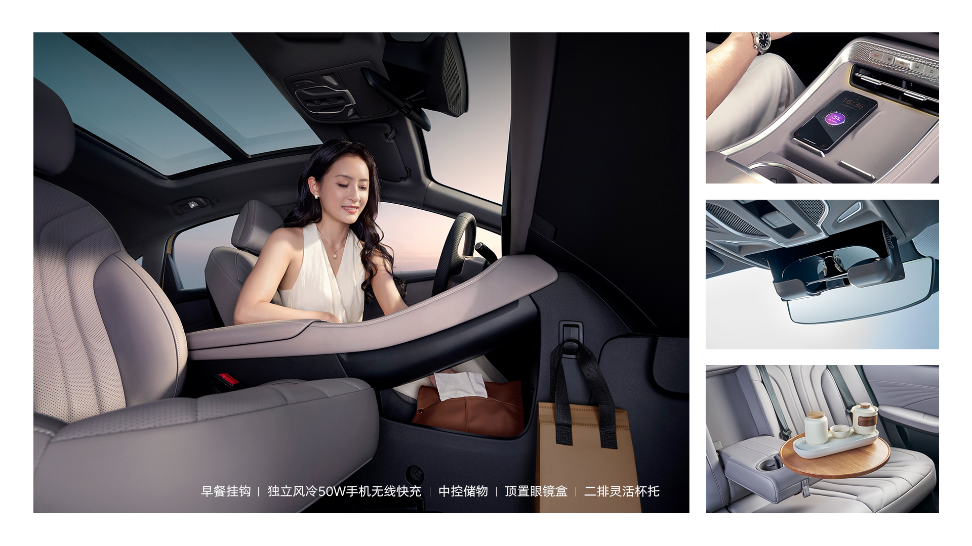 荣威M7DMH在细节处彰显豪华,以全车31处精心规划的储物空间,构建了一套完整的“便利哲学”。从专设的早餐挂钩、支持独立风冷的50W手机无线快充,到触手可及的中控储物格与顶置眼镜盒,乃至灵活的二排杯托,每一处设计都旨在让随身物品各安其位,让您的旅途从此告别凌乱,尽享从容。
