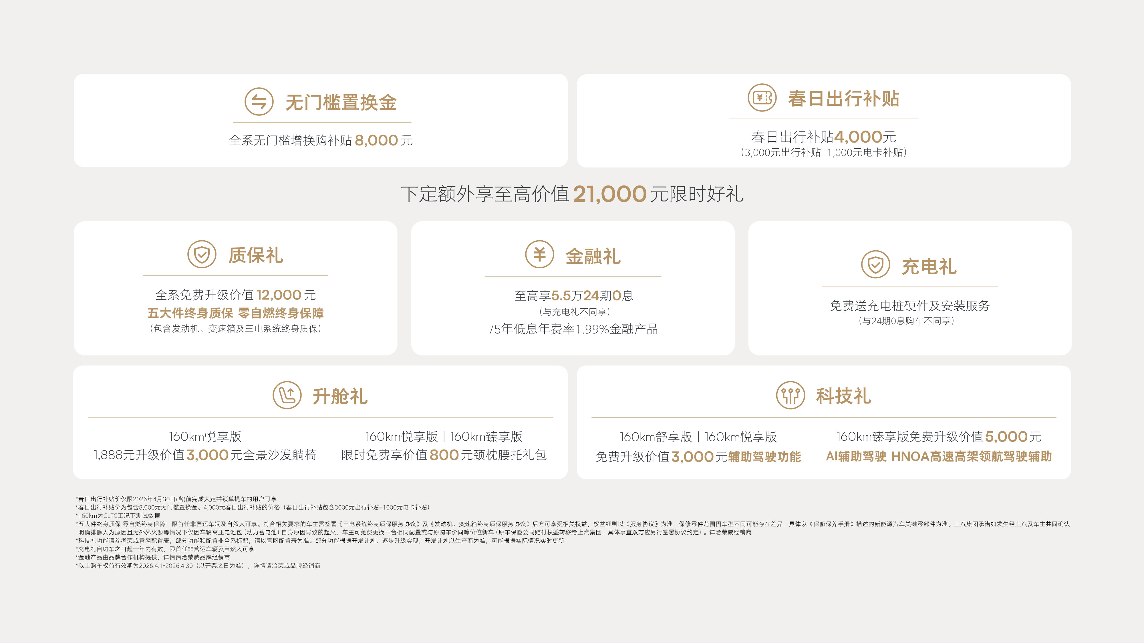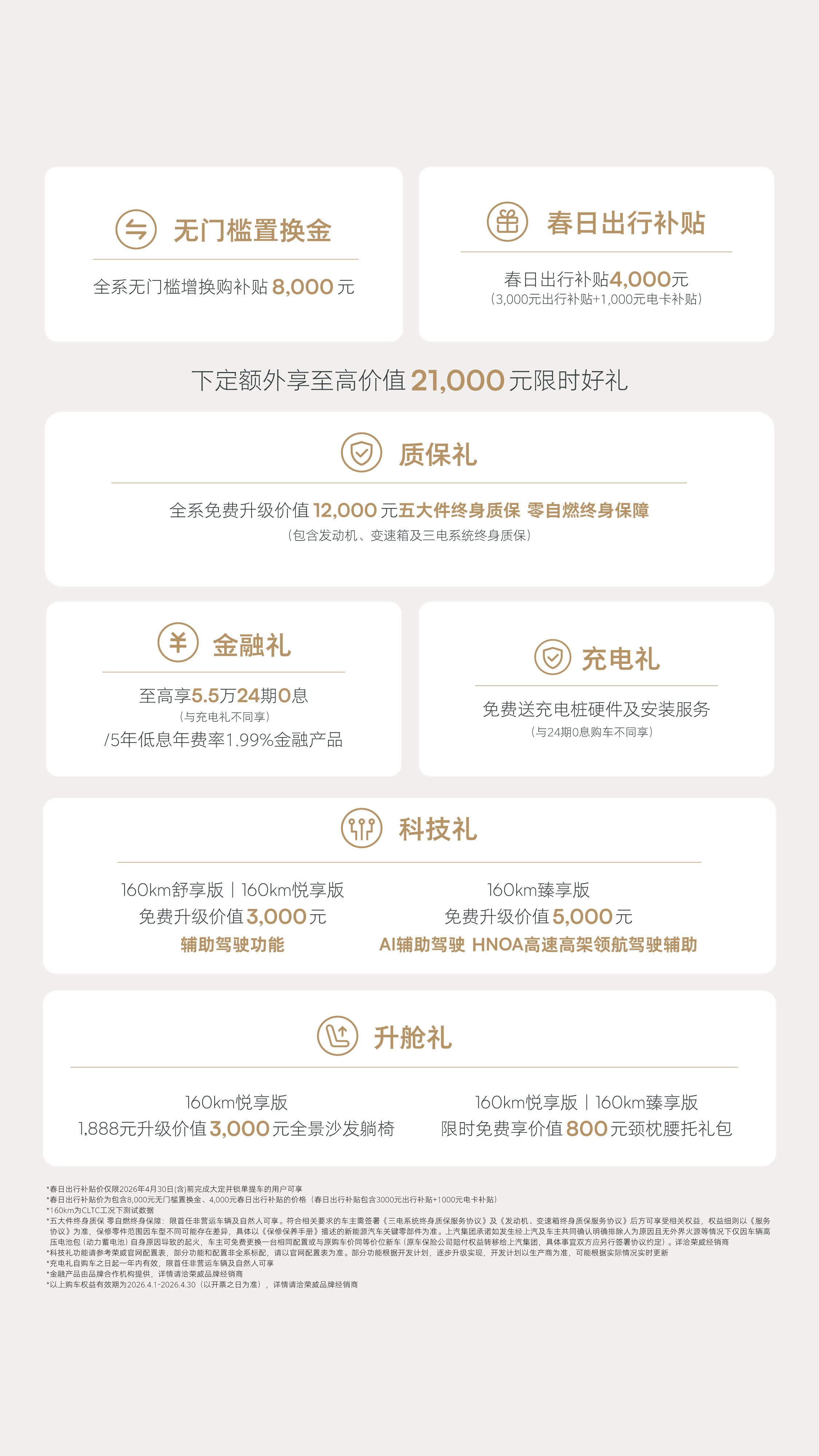 无门槛置换金 全系无门槛增换购补贴8000元 限时双倍膨胀金1000元定金抵 5000元购车款 下定额外享至高价值18000元限时四重礼 质保礼 全系免费升级价值12000元 五大件终身质保 零自燃终身保障(包含发动机、变速箱及三电系统终身质保) 科技礼 160km舒享版| 160km悦享版免费升级价值3000元 全维辅助驾驶 160km臻享版 免费升级价值5000元 AI辅助驾驶 高速高架NOA 升舱礼 160km悦享版1888元升级价值3000元全景沙发躺椅 160km悦享版|160km臻享版 限时免费享价值800元颈枕腰托礼包 金融礼 至高84期超长贷;日供低至14元起更有各类灵活金融产品可供选择 限时美好价仅限2025年11月30日(含)前完成大定井锁单提车的用户可享 限时美好价为已包含8000元无门槛置换金及1000元定金抵5000元购车款后的价格 160km为CLTC工况下测试数据 五大件终身质保 零自燃终身保障:限首任非营运车辆及自然人可享。符合相关要求的车主需签署《三电系统终身质保服务协议》及《发动机,变速箱终身质保服务协议》后方可享受相关权益,权益细则以《服务协议》为准,保修零件范围因车型不同可能存在差异,具体以《保修保养手册》描述的新能源汽车关键零部件为准。上汽集团承诺如发生经上汽车主共同确认明确排除 人为原因且无外界火源等情况下仅因车辆高压电池包(动力蓄电池)自身原因导致的起火,车主可免费更换一台相同配置或与原购车价同等价位新车(原车保险公司赔付权益转移给上汽集团,具体事宜双方应另行签署协议约定)。详治荣威经销商 科技礼功能请参考荣威官网配直表,部分功能和配直非全系配置,请以宫网配置表为准。部分功能根据开发计划,逐步升级实现,开发计划以生产商为准,可能根据实际情况实时更新 金融购车方案由融资租赁或第三方金融公司实现,以贷款金融机构最终审批结果为准 预售用户同享上市价格及权益(预售膨账金权益升级为上市限时双倍膨账金权益),限时美好价指包含以上购车权益后销售价格,有效期截止至2025年11月30日(含)
